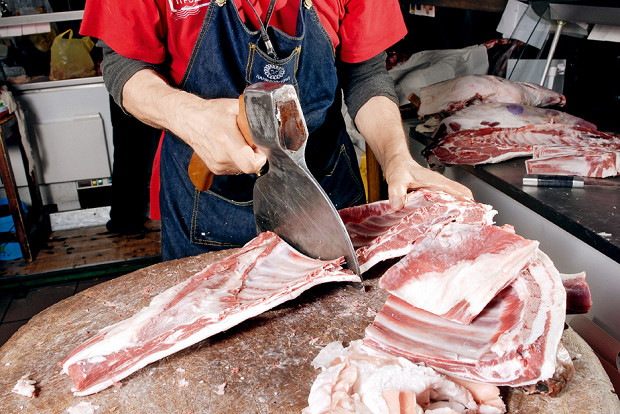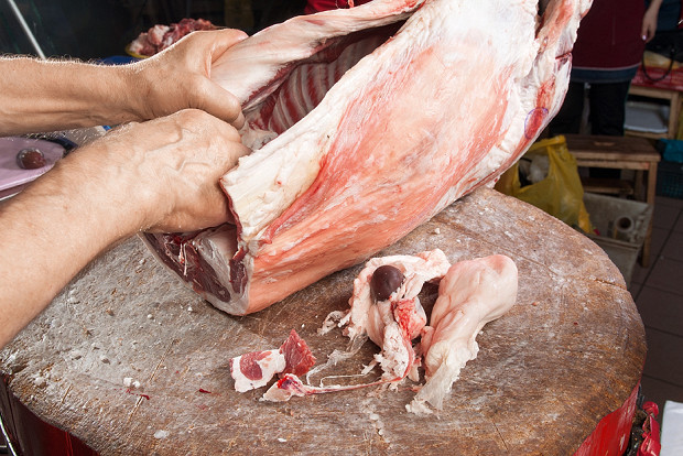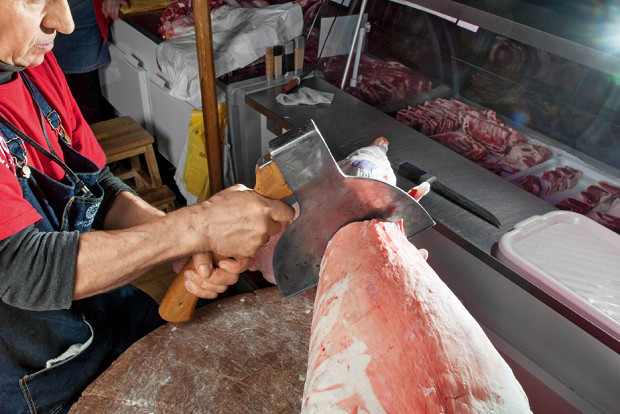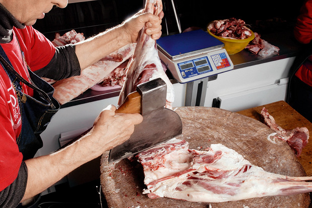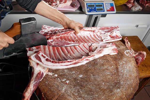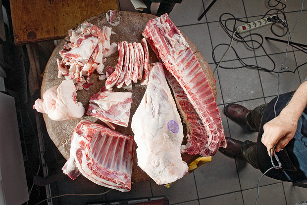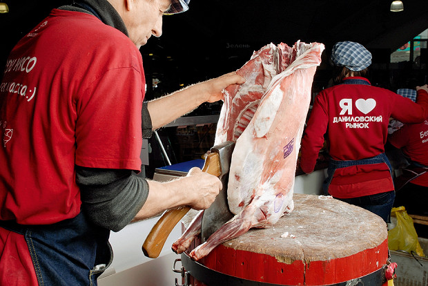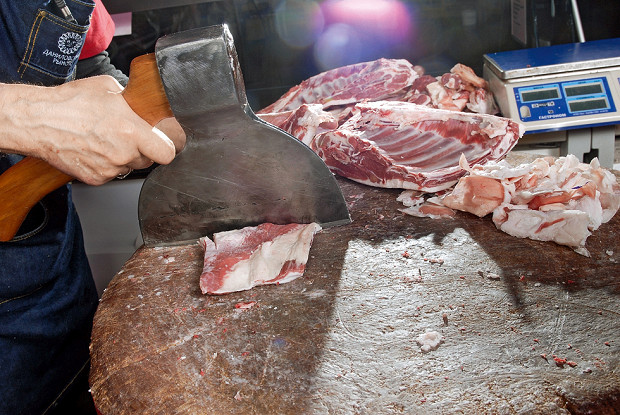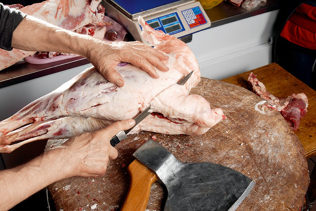 Разделка целой туши животного — не самая приятная процедура даже для заядлого мясоеда. Несмотря на ее масштабы, перечень нужных инструментов невелик: нужно вооружиться топором (сойдет и обыкновенный дачный), большим острым ножом и найти устойчивую поверхность. Все это есть под рукой у каждого мясника на любом рынке Москвы — однажды Владимир с Даниловского показал нам, как со всем этим управляться.