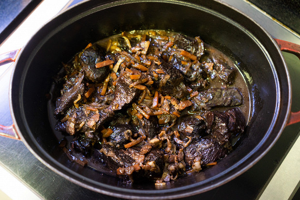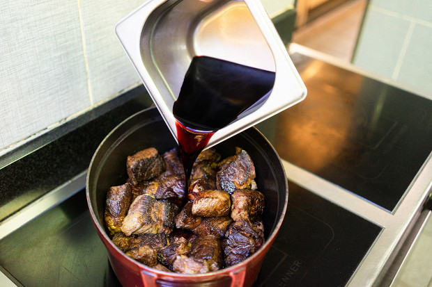 Залейте мясо литром красного сухого вина. А лучше так: выпарьте его предварительно в два раза в кастрюле на сильном огне, чтобы добавить его сразу в концентрированном виде. Настоятельно рекомендую сделать именно так: за 3 часа в духовке вино выпарится, но не настолько, чтобы придать соусу самые лучшие вкус и консистенцию.