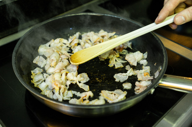 Растопите на сковороде 100 грамм мелко нарезанного бекона. Берите тот, в котором много жира. Можно использовать и сало, самое обычное. Когда бекон или сало разойдется, процедите, оставьте на сковороде только жир. Остатки бекона или сала отложите, они нам еще пригодятся.