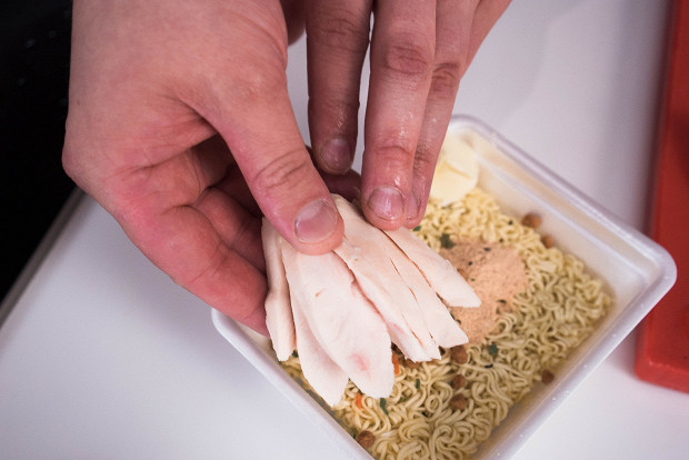 Затем положите к лапше сыр и курицу, залейте все кипятком — и оставьте на пять минут.