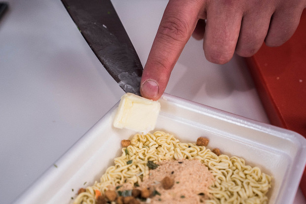 Если вдруг есть под рукой сливочное масло (например, поезд стоит на станции достаточно долго, чтобы сбегать в магазин), добавьте его к лапше. С маслом же всегда вкуснее. Еще и питательнее.
