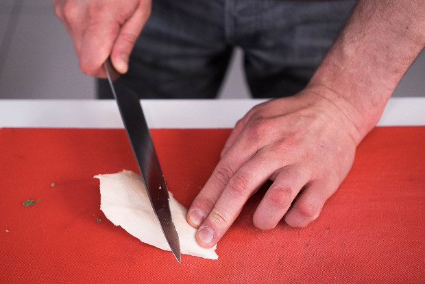 Затем нарезать курицу тонкими дольками. Думаю, на упаковку доширака достаточно 70 грамм куриной грудки. Вообще, кроме курицы в доширак можно добавлять практически все что угодно: мясную нарезку (карбонад, грудинку, бекон), говядину, кусочки белой рыбы. С красной рыбой я не пробовал делать, но подозреваю, что будет невкусно.