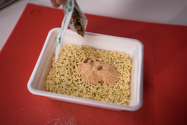 В дороге собрать блюдо нужно так. Сначала откройте упаковку и всыпьте все специи.