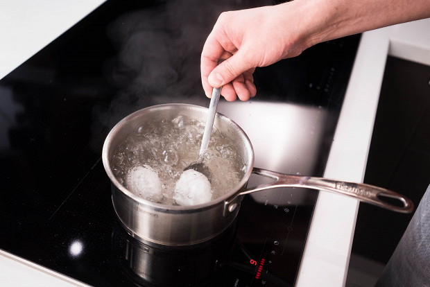 Яйца нужно опустить в кипящую воду и варить 4–5 минут. Затем, как обычно, ополоснуть под холодной водой, чтобы потом они легче чистились.