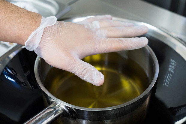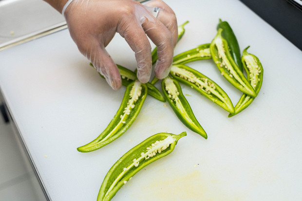 Мы в ресторане измеряем температуру при помощи термометра. Если у вас его нет, полагайтесь на ощущения: руке над маслом должно быть горячо, но не слишком, не так, чтобы хотелось немедленно ее убрать. Масло не должно кипеть — в слишком горячем масле перцы просто сгорят.