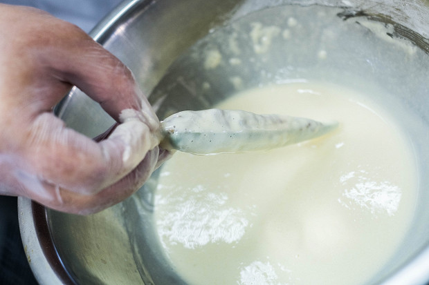 И бросьте в масло. Оно потихоньку начнет пузыриться, а вы следите за перцами: когда кляр начнет менять цвет на золотистый, процесс почти завершен.
