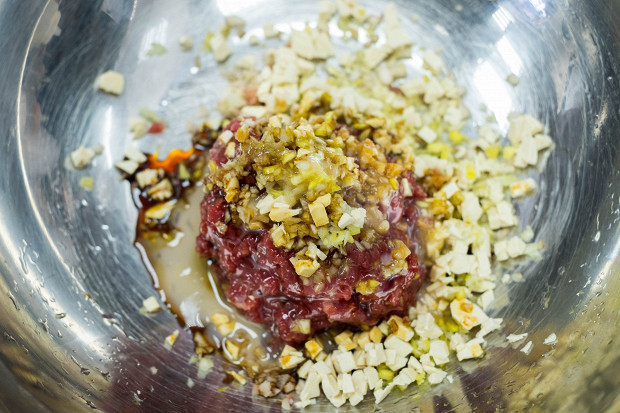 Сначала я мелко нарезаю говядину, а потом еще мельче рублю ножом для мяса в виде топорика и отбиваю им мясо в течение пары минут, чтобы оно стало более мягким.