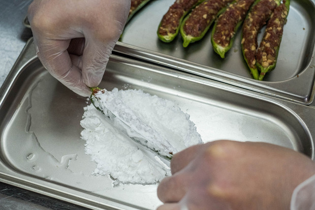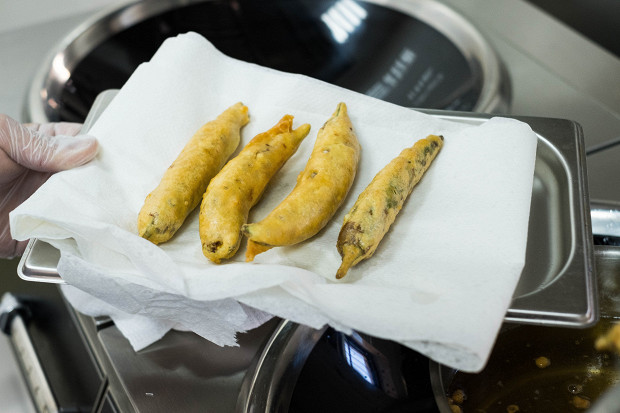 «Наши фаршированные перцы — это вариация на тему корейского фастфуда. С одной стороны, это овощи с мясным фаршем, с другой — тот самый тхвигим, ведь мы обваливаем перцы в крахмале, макаем в яйцо и кидаем жариться во фритюр. Начинка у перцев может быть практически любая — овощи, креветки, тофу, кимчи.
