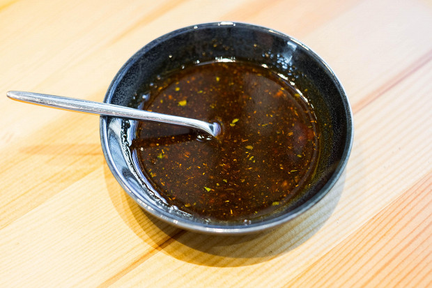 Соус для фарша мы делаем на базе соевого с добавлением овощей и саке. Возьмите 1 л соевого соуса, добавьте 60 г лука-порея, 70 г дайкона и 20 г чеснока — все крупно нарубленное. Затем добавьте 35 мл саке, 400 г тростникового сахара и 85 г глюкозы. Соберите все в кастрюле, доведите до кипения и варите на медленном огне два часа. Затем процедите, перелейте в бутылку и используйте. Это очень вкусный кисло-сладкий соус, он отлично подойдет к любому мясу. А в наш фарш мы добавляем 25 мл.