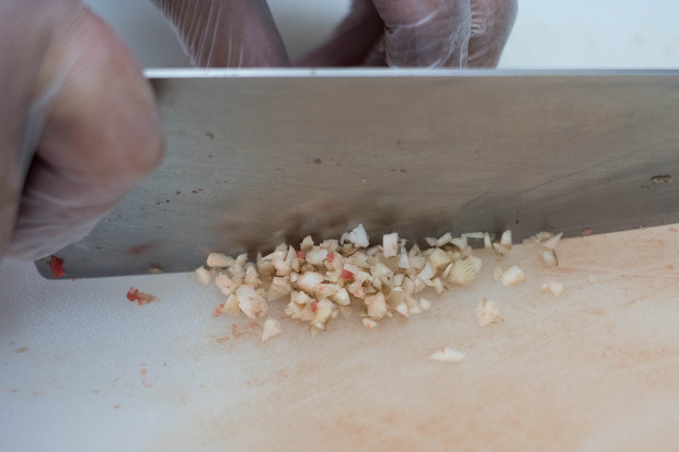 Затем надо мелко-мелко нарубить 30 г вешенок или других азиатских грибов, например, шиитаке. Шампиньоны не подойдут, они слишком сухие и жесткие. Но если кроме них ничего под рукой нет, пропустите их через мясорубку, чтобы они на фоне фарша были мягкими.