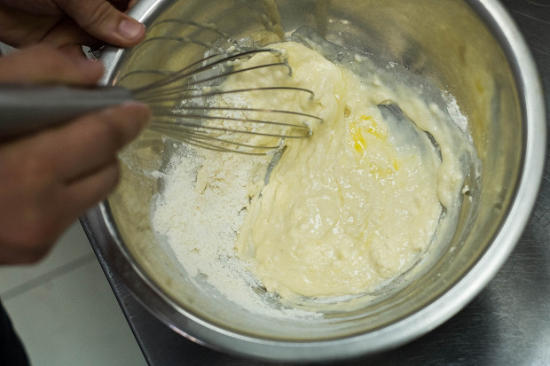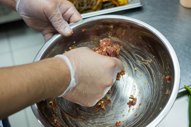 Смешайте все в миске, добавьте яйцо (50 г), 20 г муки, 5 г сухого говяжьего бульона даши (продается в корейских магазинах), 2 г соли, 1 г молотого черного перца и 7 мл кунжутного масла.