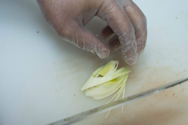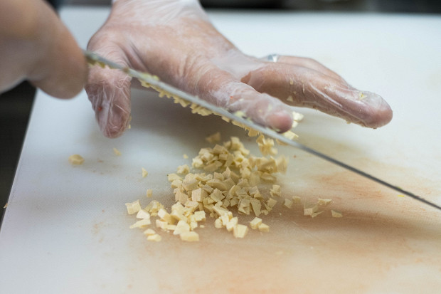 Мелко нарежьте один зубчик чеснока и 30 г лука-порея.
