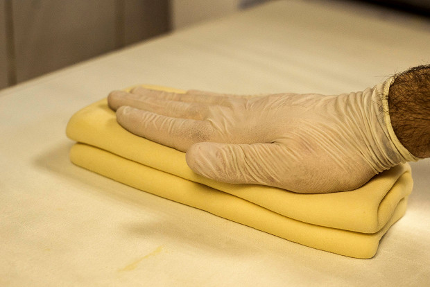 Растяните его руками. Заверните в пленку и уберите в морозилку на пять минут, чтобы оно чуть охладилось.