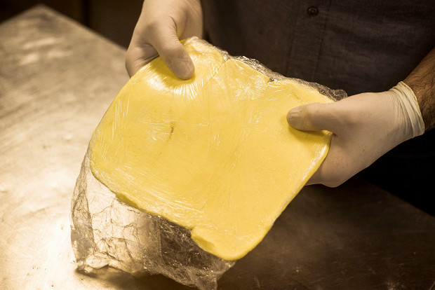 Заверните его в пищевую пленку и отправьте в морозилку на 30 минут. Это нужно, для того чтобы температуры масла и теста сравнялись и они стали единым целым. Плюс нам нужно, чтобы тесто было чуть подмороженным — но не замороженным в хлам: оно должно сохранять упругость.