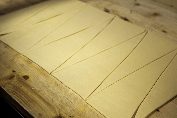 Готовое тесто раскатайте в прямоугольник размером примерно 60 на 35 см и толщиной 6 мм. Затем возьмите линейку и сделайте отметки на тесте: на нижнем крае чередуйте отметки через каждые 11,5 см и 5,2 см, на верхнем наоборот. Соедините верхние и нижние точки зигзагом по линейке и нарежьте тесто на треугольники.