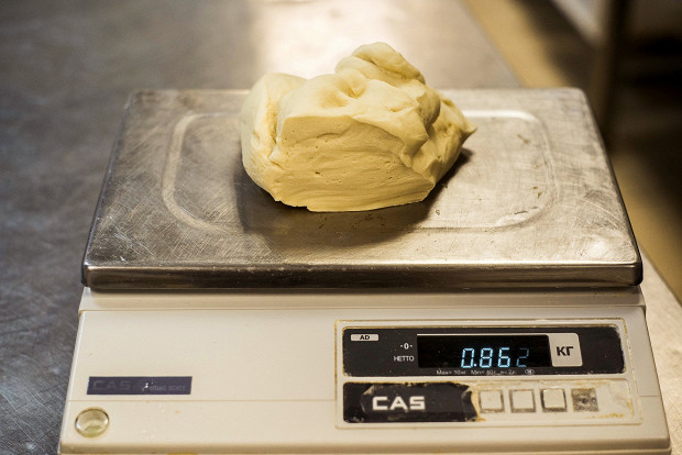 Готовое тесто разделите на порции весом примерно по 850–860 г, заверните каждую порцию в пищевую пленку и оставьте при комнатной температуре на час.