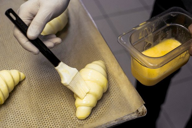 Смазывать круассаны надо очень аккуратно, легонько, кисточкой — и только по линиям закрутки, не поперек, иначе структура круассана нарушится, слои съедут друг относительно друга. Получится изделие вкусное, но некрасивое, неправильное с точки зрения традиций.