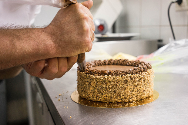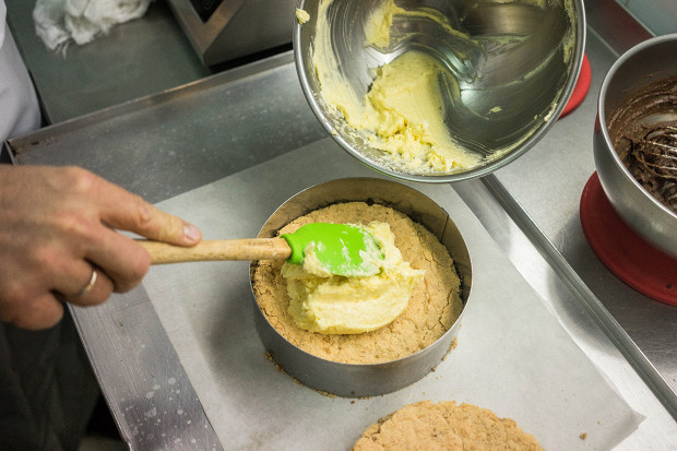 «Киевский торт — это коржи с большим количеством орехов и белка, скрепленные масляным кремом. Коржи называются «воздушным полуфабрикатом»; строго говоря, это нечто среднее между безе и бисквитом. Также в рецептуре есть сироп «шарлотт», в нем ничего сложного, но нечасто встречаешь сироп, уваренный из яиц с молоком.