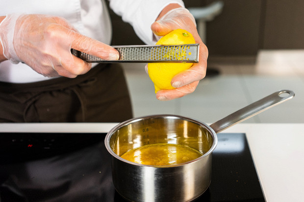 Натрите в соус цедру четверти лимона. Размешайте, уваривайте на среднем огне в течение пяти минут. Добавьте 25 мл ликера «гран-марнье». Оставьте все увариваться на небольшом огне, пока вы будете выпекать блины.