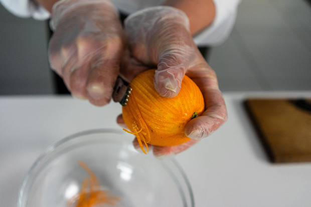 Пока тесто стоит в холодильнике, натрите цедру одного апельсина. Сам апельсин очистите от остатков кожуры, разделите на сегменты, снимите пленки. Им мы будем украшать готовое блюдо.