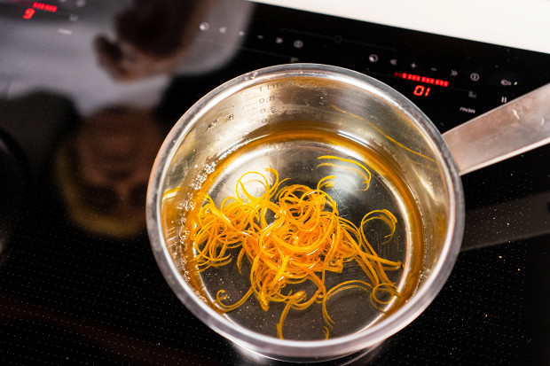 Положите цедру в сотейник, налейте в него немного воды, чтобы полностью покрыть цедру. Доведите до кипения, слейте воду, налейте новую, снова поставьте все на огонь и доведите до кипения. За время бланширования вся горечь из цедры уйдет. Слейте воду, залейте цедру концентрированным сахарным сиропом (залейте 1,15 кг сахара 850 мл воды, доведите до кипения и размешайте до полного растворения, остудите). Доведите до кипения, прокипятите в течение пары минут и процедите. Готовую цедру положите на бумажное полотенце и дайте остыть.