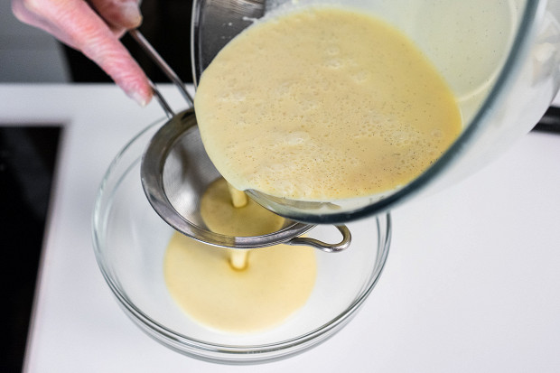 Пробейте тесто блендером. Протрите через сито, чтобы отфильтровать комочки.