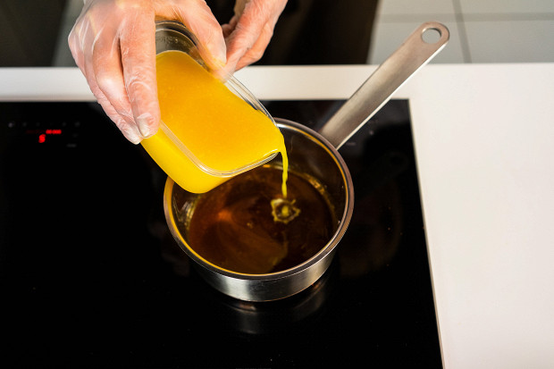 Для апельсинового соуса растопите на медленном огне 50 грамм тростникового сахара — непрерывно помешивая, чтобы он не пригорел. Когда весь сахар превратится в карамель, залейте ее 300 мл свежевыжатого апельсинового сока. Вливайте аккуратно: вначале смесь начнет шипеть и пузыриться.