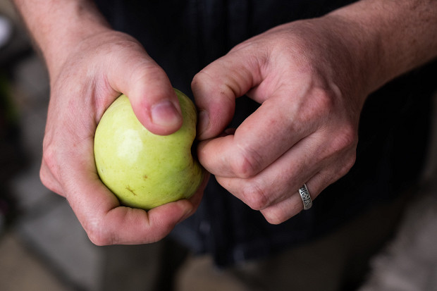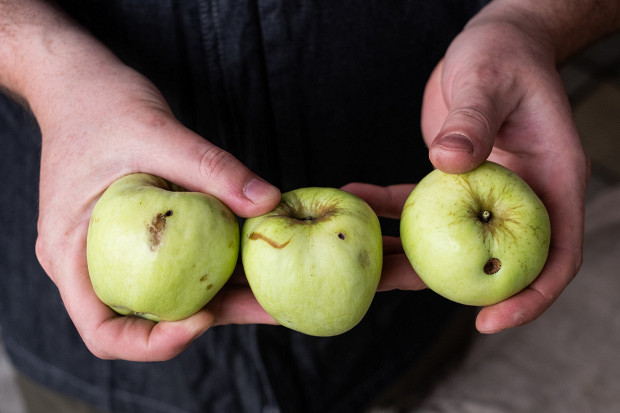 Надо использовать только снятые яблоки, паданцы не берите. Во время падения яблоки травмируются. У них появляются мятые бочка. Они начнут гнить, что может испортить всю партию. Также мы не берем яблоки с червоточинами и другими повреждениями. Запомните: чем меньше повреждений, тем лучше яблоки подходят для мочения. Вот такие, как я показываю, — не берите.