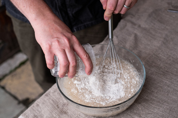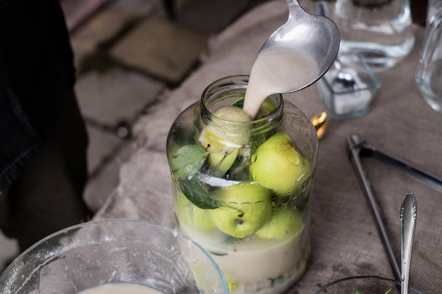 Существует несколько видов заливок. Самая простая — соль, сахар и вода. Но лучше использовать заливки, содержащие молочнокислые бактерии. Это варианты с содержанием ржаного или ячменного солода, можно использовать ржаную муку, как мы сейчас и сделаем. Кроме того, есть сладкие заливки, так называемая сыта. Сыта — это смесь меда с водой, доведенная до кипения. В нее добавляют гвоздику и палочки корицы. С такой заливкой моченые яблоки будут иметь сладкий вкус. В некоторые заливки добавляют горчичный порошок. Также используется заливка из соли, воды и корня солодки, то есть лакрицы. Самая экзотическая заливка, которую я встречал, — это кефир и сухая горчица. Это новый вариант, ведь кефир в русской кухне используется с начала XX века. Вообще, можно пробовать и экспериментировать, чтобы подобрать то, что понравится вам. Единственное, на эксперименты нужно время, потому что проверить, что получится с той или иной заливкой, можно будет только через месяц.