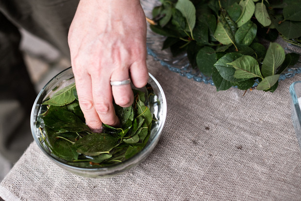 Раньше дно бочек выстилали соломой, ее же клали поверх яблок. Вместе с соломой использовали листья — смородиновые или вишневые. Если вы используете банку, то листьев достаточно. Промойте их в холодной воде. У нас вишневые, но вы можете использовать и смородину. Листья можно использовать как свежие, так и высушенные.