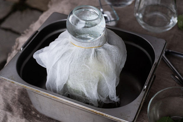 Накройте банку чистой марлей и положите гнет. Мы взяли розетку с водой, гнет не должен быть очень тяжелым. Смысл не в том, чтобы спрессовать содержимое банки (что важно в случае с квашеной капустой, например). Гнет нужен для того, чтобы яблоки не всплывали, чтобы они все время целиком были в воде.