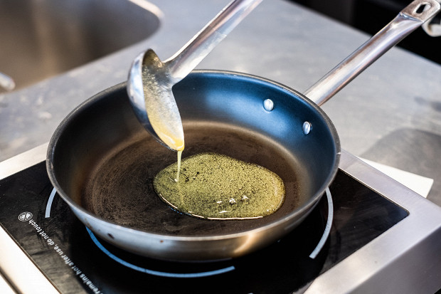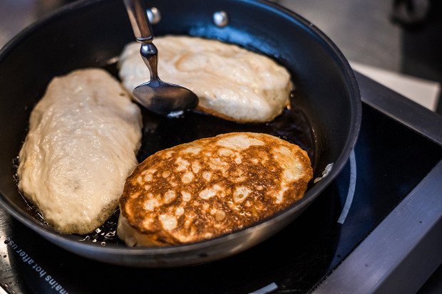 Итак, возьмите сковороду с толстым дном, разогрейте на огне ниже среднего, примерно на третьем из 9 делений. Оставьте ее на таком огне минут на 10. Затем налейте на разогретую сковороду топленое сливочное масло — оно придаст оладьям приятный ореховый аромат.