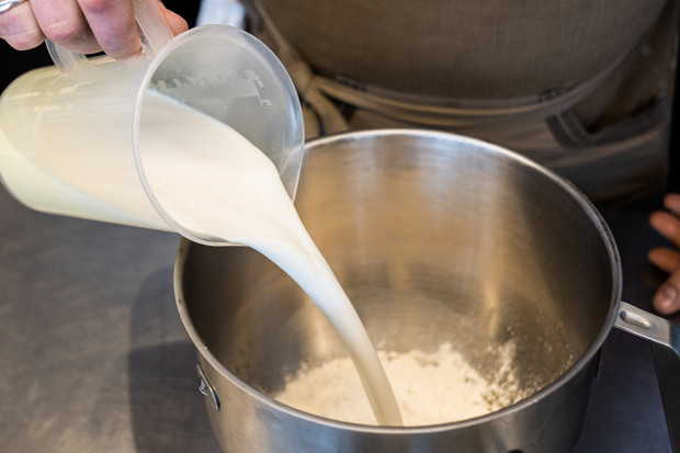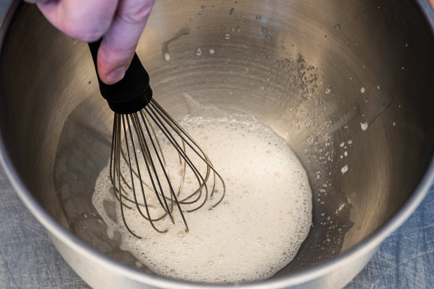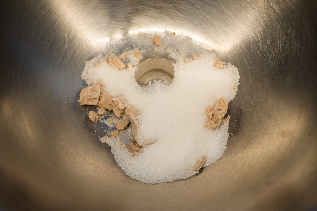 Добавьте немного молока комнатной температуры, так чтобы покрыть сахар с дрожжами. Перемешайте все вручную венчиком, чтобы дрожжи полностью растворились: не должно быть никаких комочков. На это потребуется примерно пять минут.