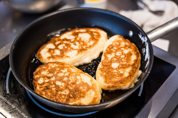 Зачерпните тесто соусником и выложите на сковороду. У нас на одну сковороду поместилось три оладьи. Учтите, что тесто на сковороде начнет мгновенно подниматься из-за температуры.