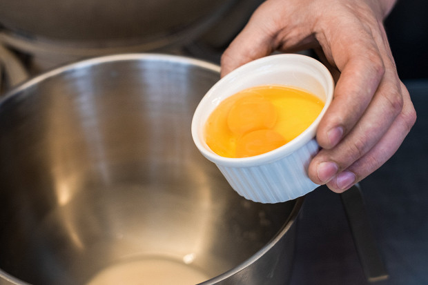 Добавьте 100 грамм яиц. Затем добавьте 250 грамм пшеничной муки высшего сорта.