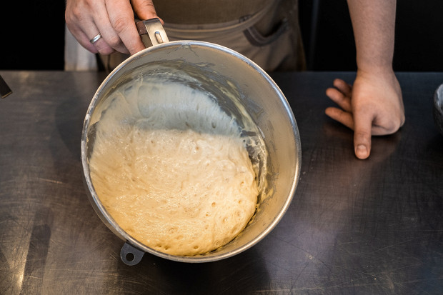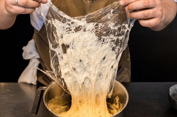 Готовое тесто может показаться жидким, но оно скорее упругое, похожее на тесто для чиабатты.