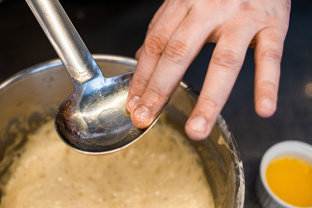 Идеальный инструмент для оладий — соусник, из него удобно выкладывать тесто на сковородку. Смажьте соусник топленым маслом. Это нужно для того, чтобы тягучее тесто не прилипало к его поверхности.