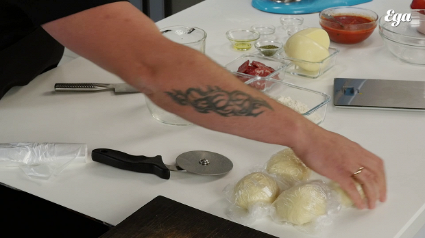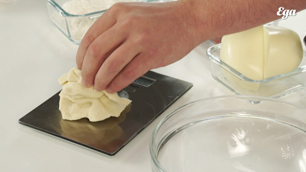 После пяти минут пребывания в тестомесе тесто готово. Многие добавляют в него сухие ароматные травы, но с этим нельзя перебарщивать, иначе тесто начнет подсыхать — травы будут забирать в себя воду. Или, если хотите добавить их, можно чуть-чуть увеличить объем воды. После того как тесто готово, мы должны его слегка обмять, привести его в однородное состояние. Разделите тесто на куски весом 200 г: это как раз для пиццы, подходящей под размеры обычной домашней духовки. Если она у вас совсем небольшая, можно сформировать шар весом 150 г или даже 120 г: главное, чтобы пицца вышла очень тонкой.
