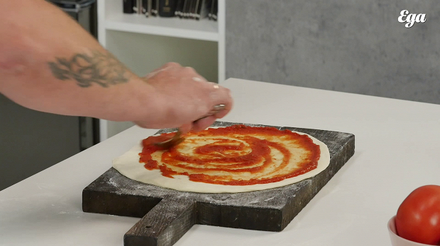 Равномерно распределите по красту полторы столовых ложки соуса для пиццы.