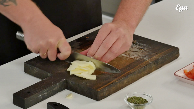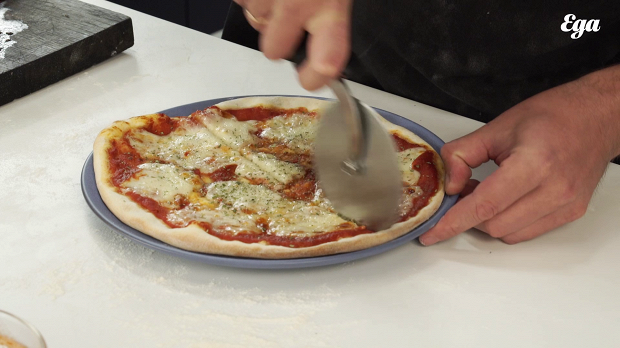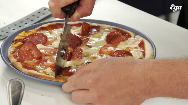 Разрежьте пиццу на восемь частей. Проверьте ее готовность — кончик куска должен стоять ровно, не опадать.