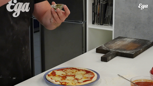 Пицца готова, ее можно уже есть, но лучше добавить еще немного сухих трав. Возьмите, например, готовую смесь «Итальянские травы» или орегано — и посыпьте пиццу.