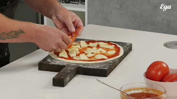 Положите сверху на сыр помидоры. Старайтесь, чтобы помидор оказался на каждом будущем куске пиццы.