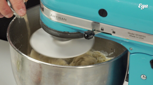 Всыпьте полкило пшеничной муки в большую емкость. Нужна самая обычная пшеничная мука, но главное, чтобы белка в ней было не меньше 13%. Добавьте туда 15 г соли, 7,5 г сахара (соотношение, как вы заметили, 2:1), а также 40 г оливкового масла. Лучше даже не extra virgin, а рафинированное, чтобы тесто не сильно пахло и не горчило. Затем влейте в смесь 250 мл воды комнатной температуры и начинайте замешивать — нужен миксер с насадкой-крюком. Тесто нужно замешивать на малых оборотах. Уже после начала замеса нужно добавить дрожжи. Но их нельзя добавлять вместе с солью, тогда они не начнут работать в полную силу. Поэтому сначала размешайте тесто до однородного состояния, чтобы не было комков, а уже потом добавьте туда 3,75 г дрожжей и продолжайте замешивать, пока тесто не станет эластичным. Почему нужны малые обороты: чтобы температура теста во время замеса не слишком увеличивалась. Нам нужно, чтобы оно не нагревалось выше 22 градусов, иначе дрожжи начнут быстро работать, тесто раскиснет, и это будет не очень хорошо.