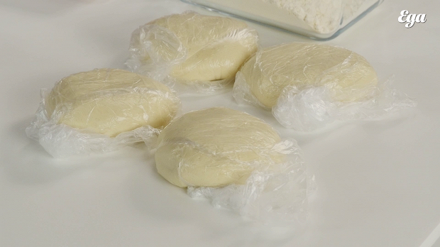 Поступите с шариком из теста точно так же, как с предыдущим: достаньте, разомните, сформируйте круг и положите его на доску, посыпанную мукой.