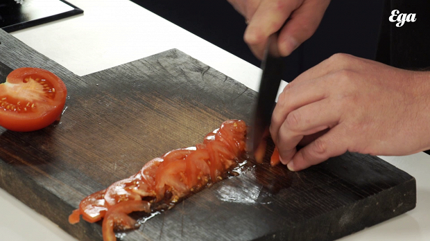 Нарежьте колбасу на тонкие дольки (на одну пиццу достаточно 15 г), а помидоры — дольками толщиной 1,5 мм.