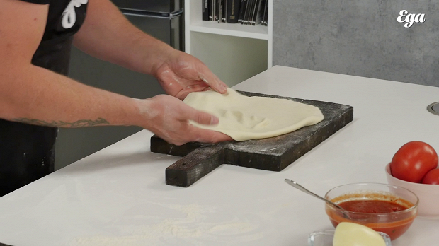 После того как вы сформировали основу для пиццы, дайте тесту минуту отдыха. После этого немного растяните тесто еще раз и избавьте его от лишней муки.