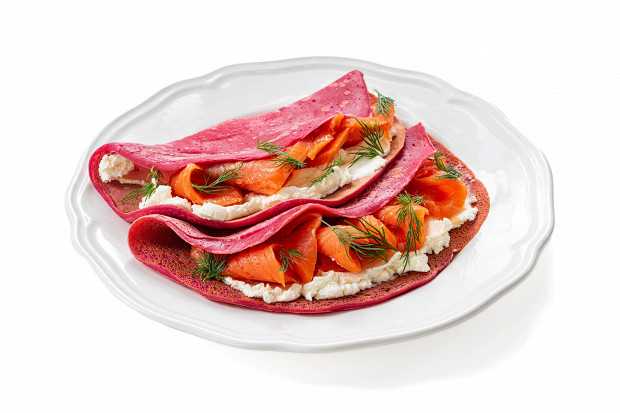 Этого красивого насыщенного цвета мы добились с помощью свеклы. Сначала мы ее запекли, затем пробили блендером вместе с молоком и кефиром, а после отправили эту смесь в тесто. Таким блинам хорошо подойдет и начинка из лосося, и сладкий наполнитель из ягод или фруктов.