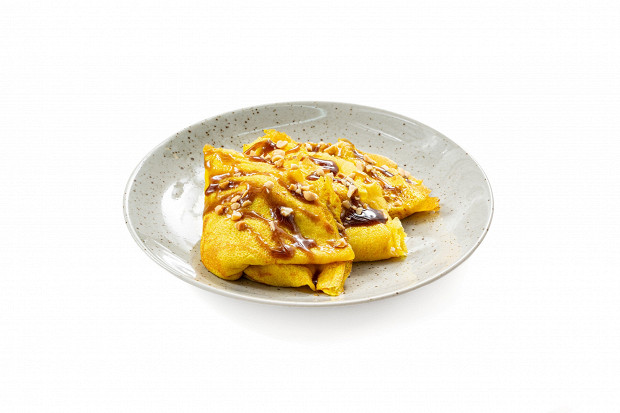 Некоторые блины и так имеют золотистый оттенок, но у этого образца все же откровенно желтый цвет, которого мы добились, отправив в тесто куркуму. К таким блинам мы придумали десертную начинку — банан с арахисом и карамельным соусом.