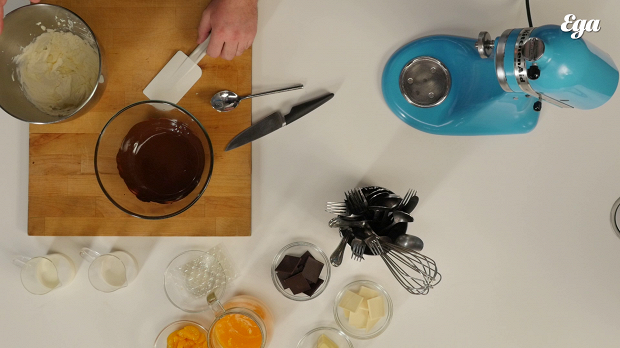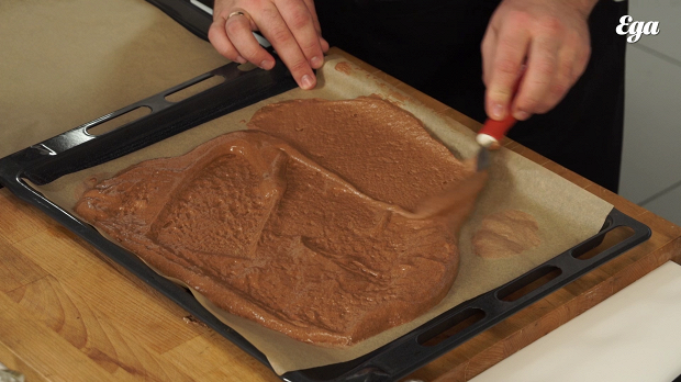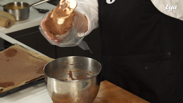 «Начнем с бисквита. Он у нас необычный — без муки. Основа, на которой он будет держаться, — темный шоколад.