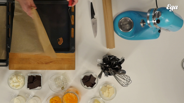 Простелите пергаментом два противня. Чтобы пергамент не бегал по ним, когда мы будем размазывать бисквит, можно прикрепить бумагу по углам с помощью небольшого количества теста.